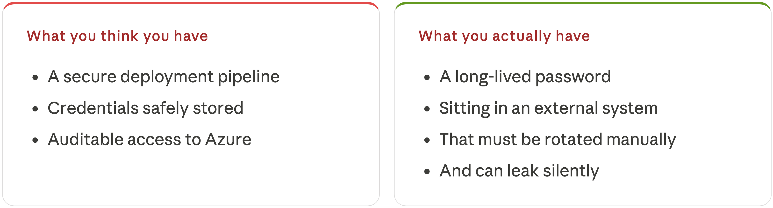You create an Entra ID app registration. You generate a client secret. You copy it into a GitHub Actions secret, usually named something like AZURE_CLIENT_SECRET. The pipeline logs in with it, gets access, deploys.